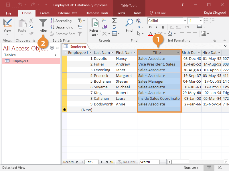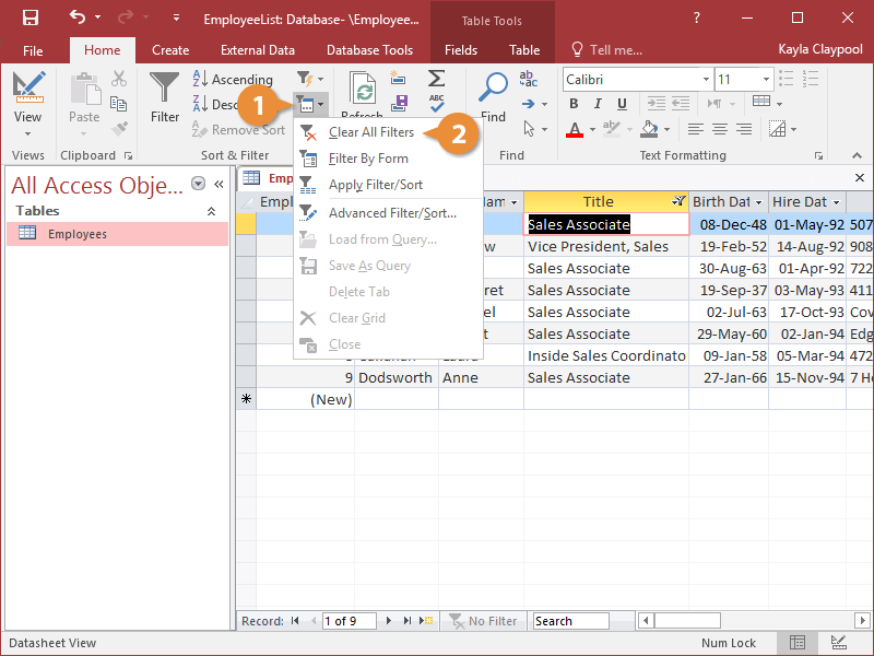 You can also clear a filter by clicking in a filtered column, clicking the Filter button on the Home tab, and selecting Clear filter from [field].