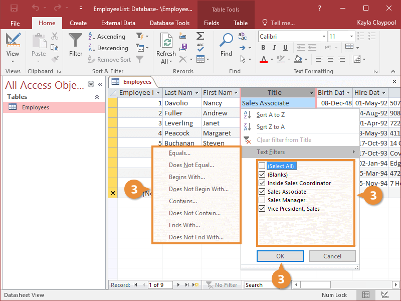 - Use the Data Type filters: These allow you to enter a filter criterion in the Custom Filter dialog box. For example, if you select Equals and enter Johnson, Access will filter out all records except for those with Johnson in that field.