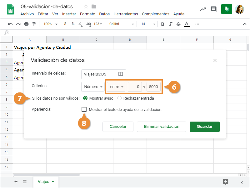 • Detener: Impide a los usuarios agregar datos inválidos en una celda.