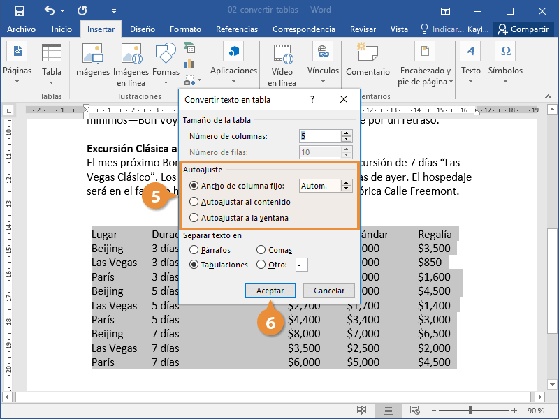 No es necesario crear una tabla desde cero cada vez. Se puede convertir una selección de texto existente en una tabla, siempre y cuando tenga el formato adecuado. También se puede convertir una tabla existente en un texto regular, en caso de que se desee mantener los datos, pero no necesariamente en una tabla.