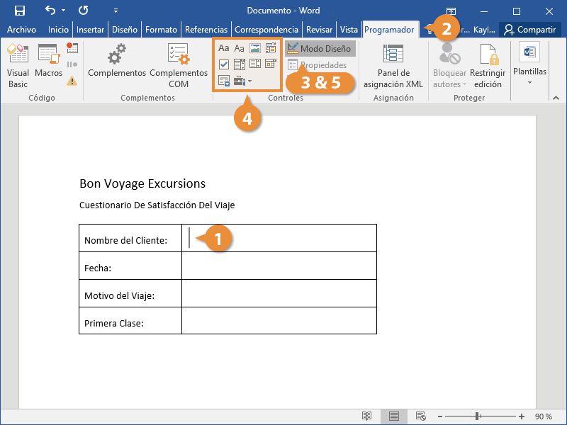 Una vez que se ha activado la pestaña Programador, y creado el diseño y estructura del formulario, es posible comenzar a agregar campos de formularios al documento con Control de contenidos.