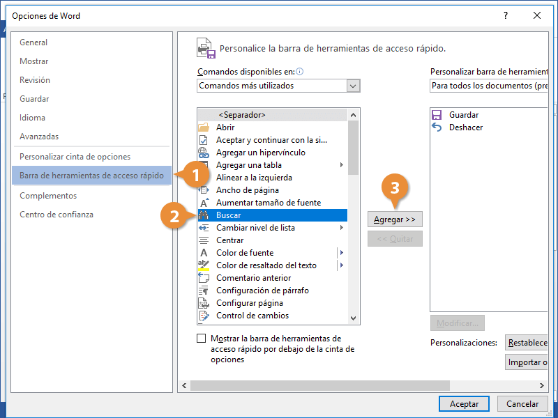 La columna a la izquierda muestra comandos que se pueden agregar a la Barra de herramientas de acceso rápido, mientras que la columna a la derecha muestra los comandos que ya se encuentran en esta.