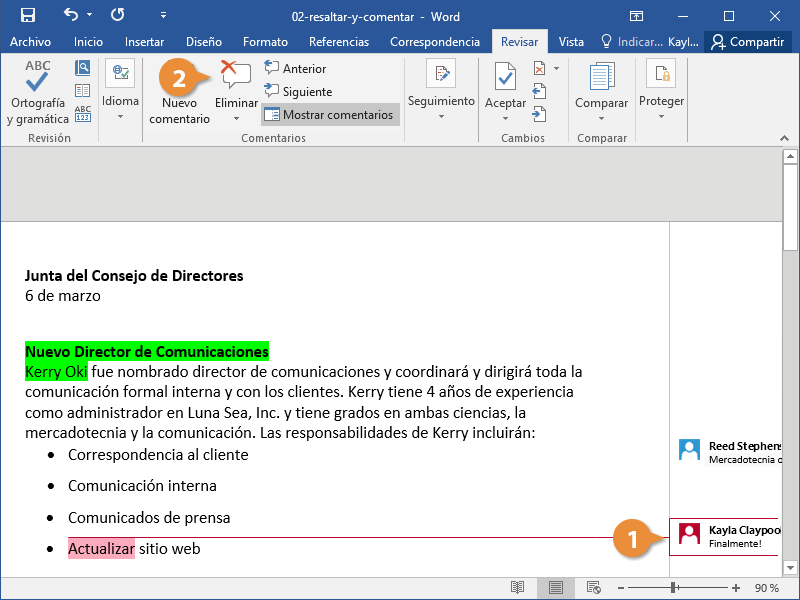 Si se desea llamar la atención de alguien hacia cierta parte del documento, es posible resaltar porciones del texto. También se puede agregar un comentario a una parte del texto si se tiene que comentar algo al respecto.