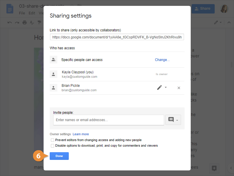 It’s easy to share a document with other people from within Docs; for example, you can send a sharing invitation to colleagues that gives them access to view or edit the file.