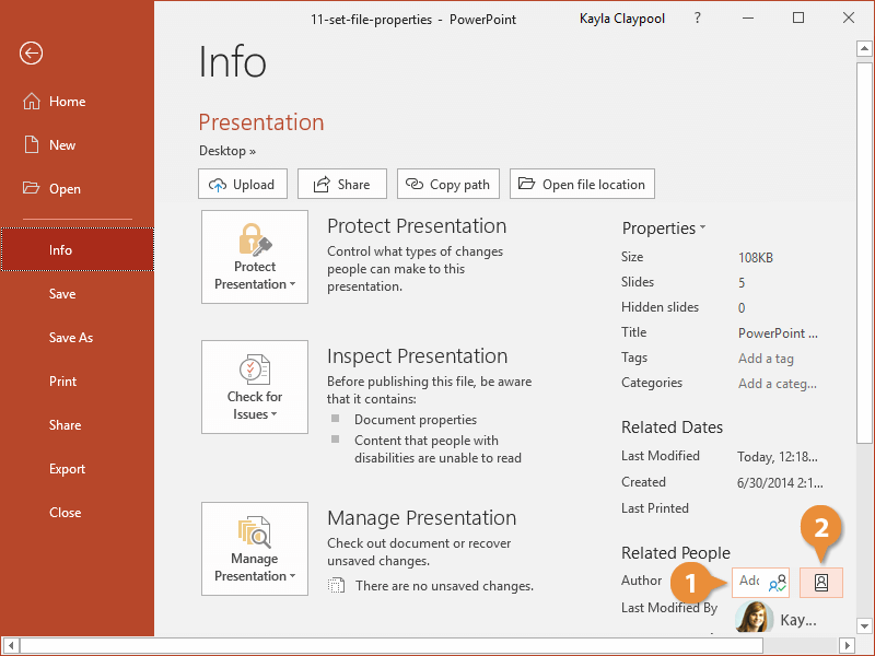 To the right of the Info section, you can see the properties of the presentation. Some of the properties are updated automatically, like the file size and the created and modified dates, but you must update others manually.