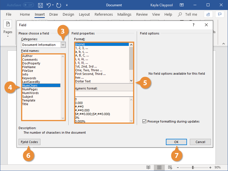 The Field dialog box opens. Different fields are listed in the left column, with the ability to narrow them down by category.