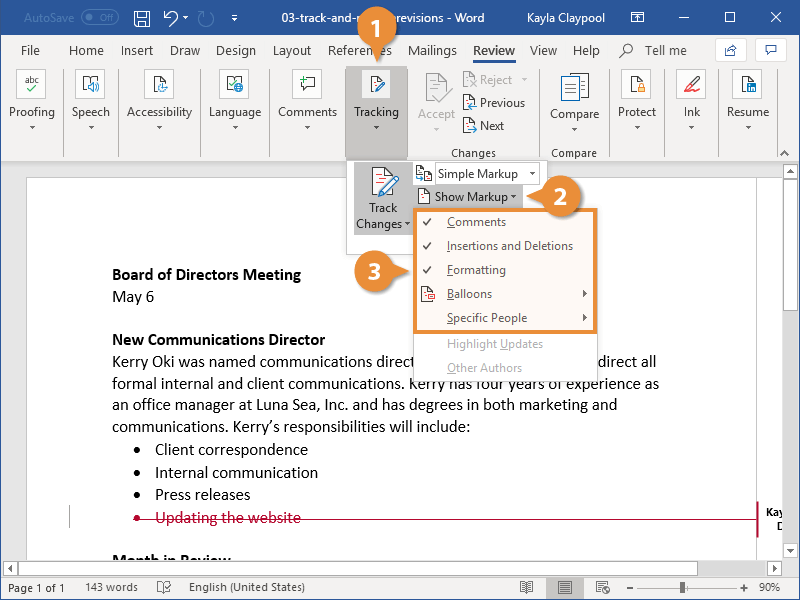 You can also use the Display for Review menu, directly above the Show Markup button, to control how detailed the markup that appears is.